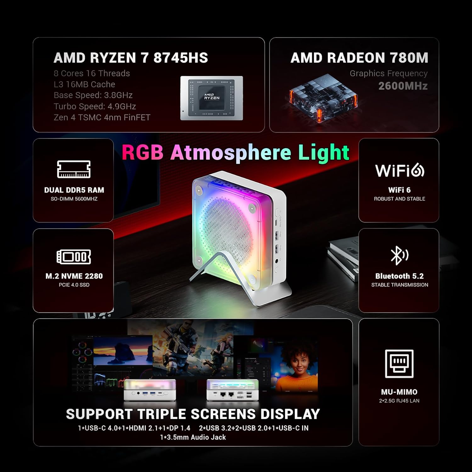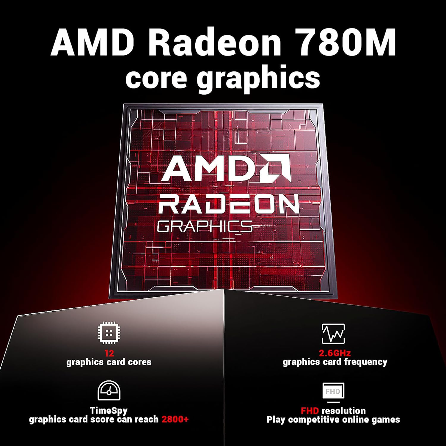 The combination of the Ryzen 8745HS CPU and AMD Radeon 780M graphics card delivers powerful graphics processing capabilities, making this mini PC suitable for gaming and graphics-intensive applications. The Radeon 780M graphics card is integrated into the processor, providing a balanced and efficient graphics solution.