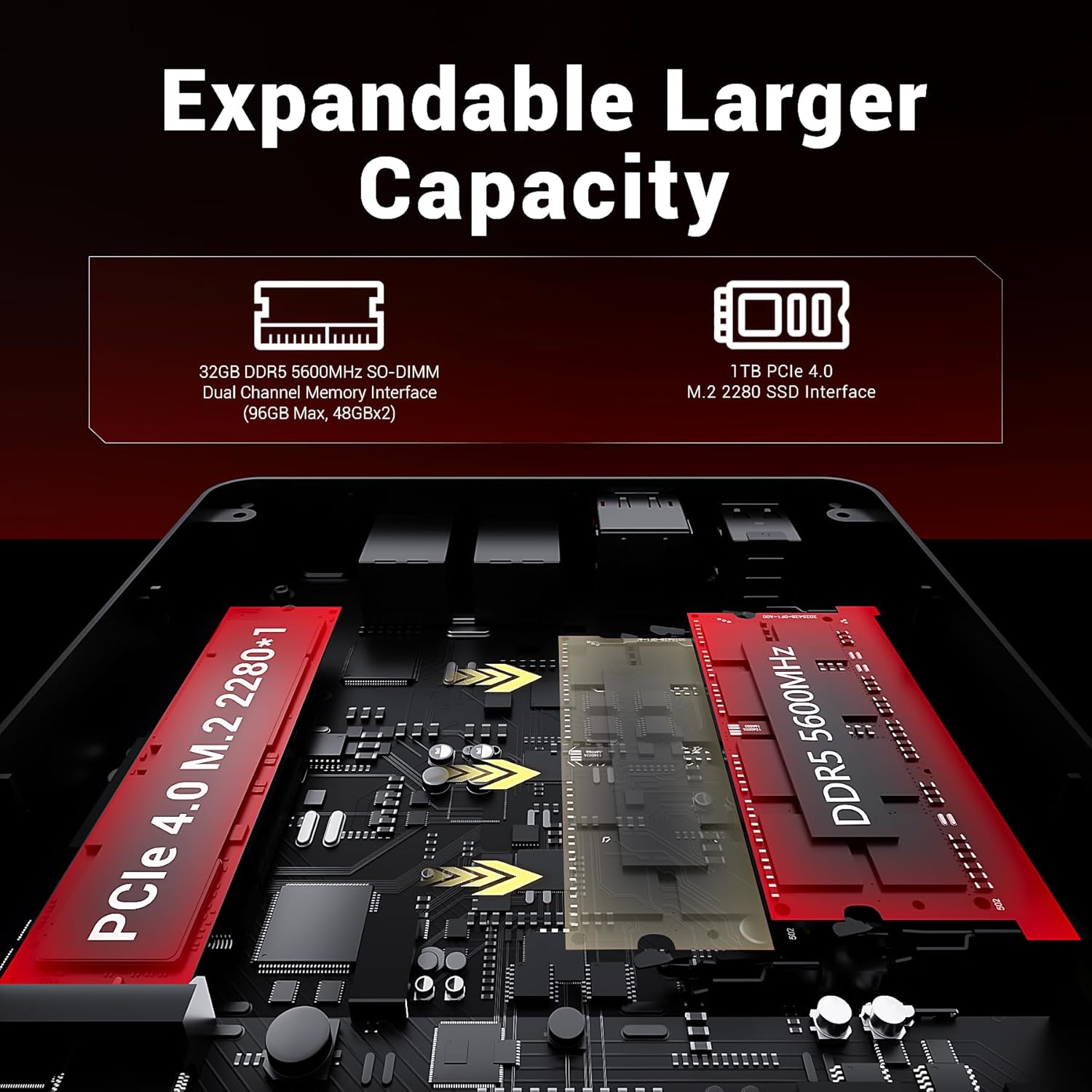The FIREBAT Mini PC Gaming Computer is equipped with an AMD Ryzen 8745HS CPU, which boasts 8 cores and 16 threads, operating at a frequency of 3.8-4.9GHz. This processor, based on the Zen 4 architecture, is paired with 32GB of DDR5 5600MHz memory, consisting of two 16GB RAM modules. The memory can be expanded up to 96GB, providing ample room for future upgrades. For storage, the mini PC features a 1TB PCIe 4.0 M.2 2280 SSD, offering fast data access and transfer speeds.