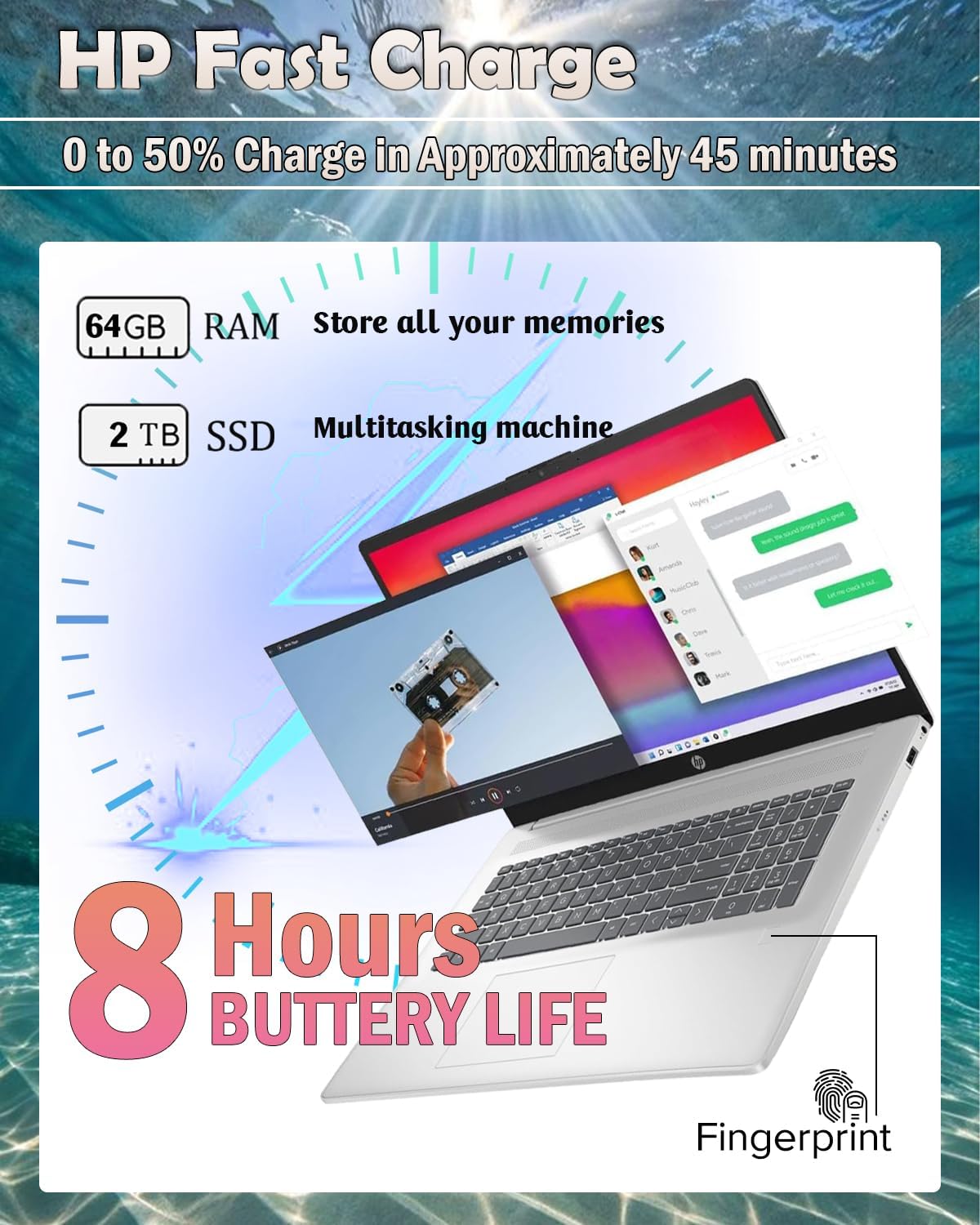 The HP 17.3 Laptop Computer for Business offers a range of connectivity options, including Wi-Fi 6, Bluetooth 5.3, and multiple ports such as USB-C, USB-A, and HDMI. The laptop also features a precision touchpad, a full-size backlit keyboard with a numeric keypad, and a fingerprint reader for added security. The HP TrueVision 720p HD camera with dual array digital microphones ensures clear video calls, while the dual speakers provide an immersive audio experience.