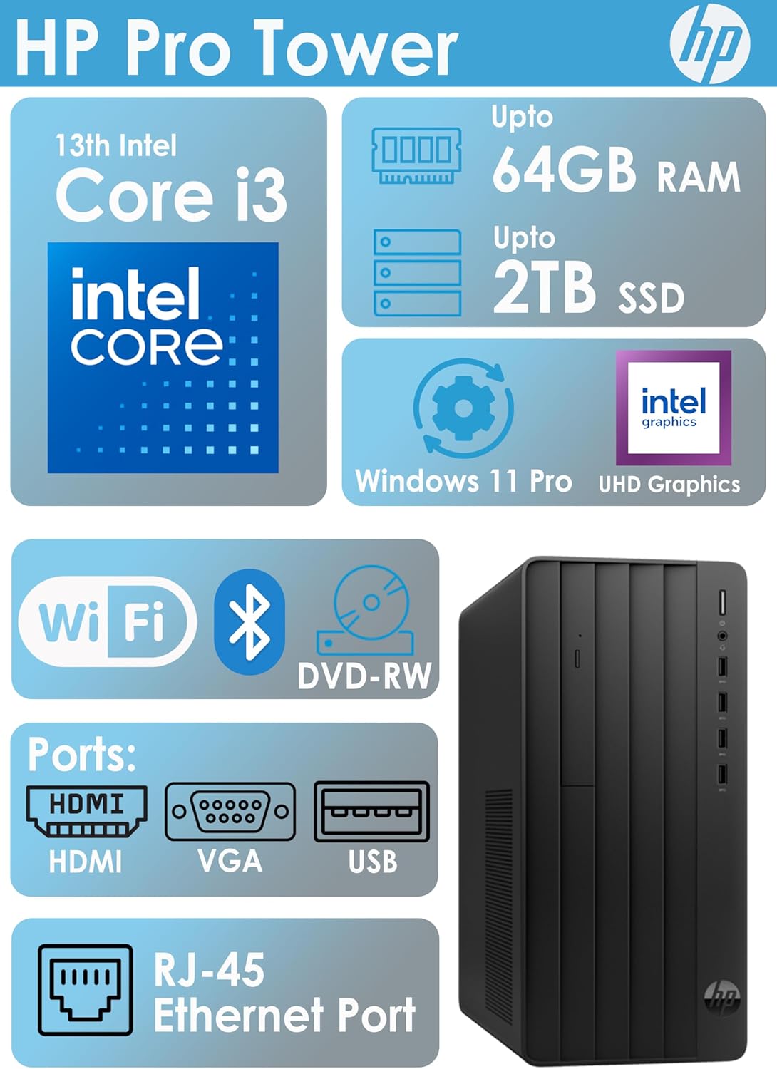 The HP Desktop Tower Pro is a powerhouse of performance and productivity, designed to deliver exceptional computing capabilities and entertainment experiences. With its 13th Intel Core Ultra-Fast CPU, ample RAM and storage, and wide range of ports and connectivity options, this desktop tower is ideal for individuals and businesses seeking a reliable and high-performance computer system. The inclusion of Windows 11 Pro and a stylish keyboard and mouse set makes the HP Desktop Tower Pro a complete and integrated solution for work, play, and creativity. Whether you’re a professional, creator, or simply looking for a reliable computer system, the HP Desktop Tower Pro is an excellent choice that promises to revolutionize your computing experience.