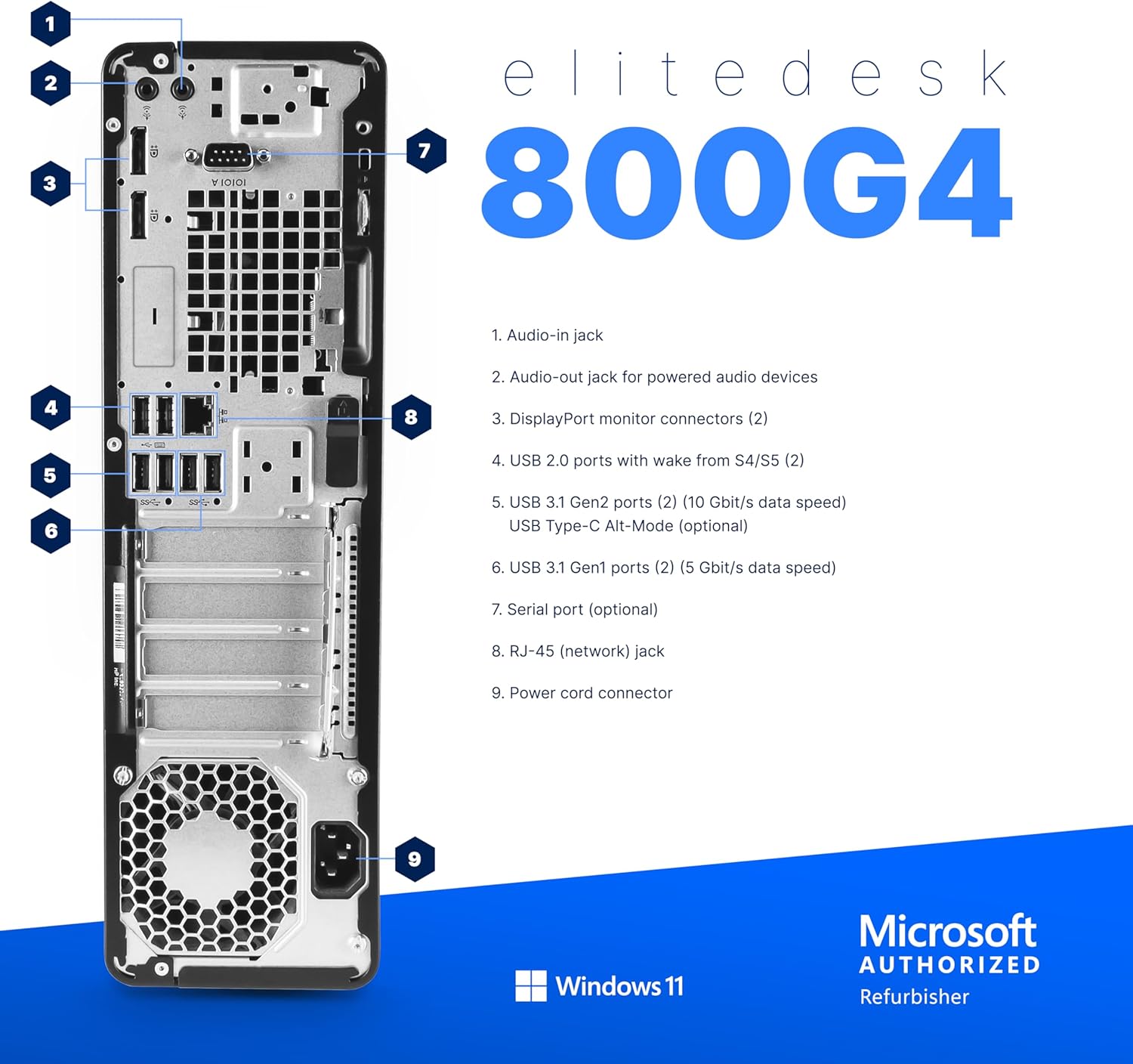 The HP EliteDesk 800G4 features a comprehensive range of ports, including 6x USB 3.1 Gen 1 ports, a USB-C port, 2x DisplayPorts, a Network Jack, and 3.5mm audio in/out jacks. These ports provide support for multiple devices and displays, ensuring that users can connect all their peripherals and accessories with ease.