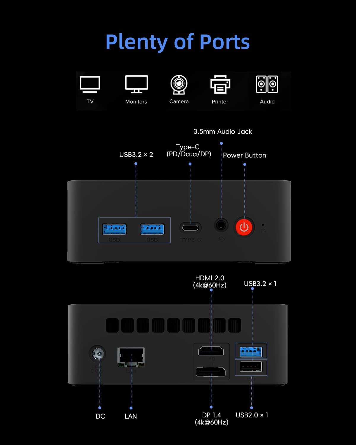 The mini PC features dual-band WiFi (2.4 GHz and 5 GHz) and Bluetooth technology, ensuring fast and stable wireless connectivity. The various ports, including one Type-C (full-featured), three USB 3.2 ports, one USB 2.0 port, one HDMI 2.0 port, one DP 1.4 port, one RJ-45 Ethernet port, one 3.5mm audio jack, and one DC jack, provide ample connectivity options for peripherals and accessories.
