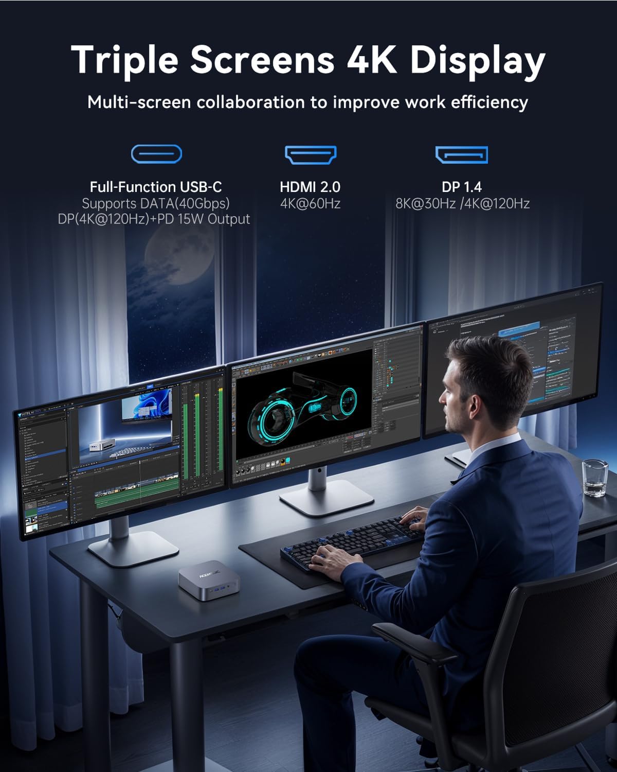 The mini PC is equipped with a 1TB PCIe 4.0 NVMe SSD, which provides fast storage and can be expanded up to 4TB, offering ample space for storing files, programs, and data. The USB4 port takes performance further, boasting up to 40Gbps transfer speeds, making it possible to move a 3GB 4K video in just 1 second. The mini PC also supports DisplayPort Alt-Mode, letting you drive a 4K 60Hz monitor directly, and paired with other video ports, enables triple display output for expanded multitasking.