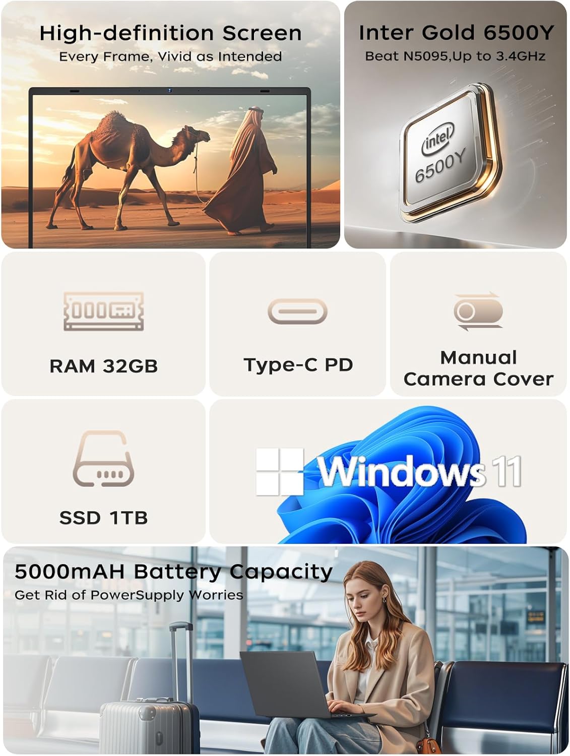 In conclusion, the Laptop Computer with Gold 6500Y Processor is a powerful device that delivers smooth performance, vibrant visuals, and fast speed. With its Pentium Gold 6500Y Processor, 32GB of RAM, and 1TB SSD storage, this laptop is ideal for users who need a reliable device for daily use. The 15.6-inch FHD IPS display, multiple ports, and connectivity options make it perfect for entertainment, productivity, and creativity. With its ergonomic keyboard and touchpad, this laptop provides a comfortable and accurate typing experience. Overall, this laptop is a great option for anyone looking for a powerful and efficient device that meets their needs.