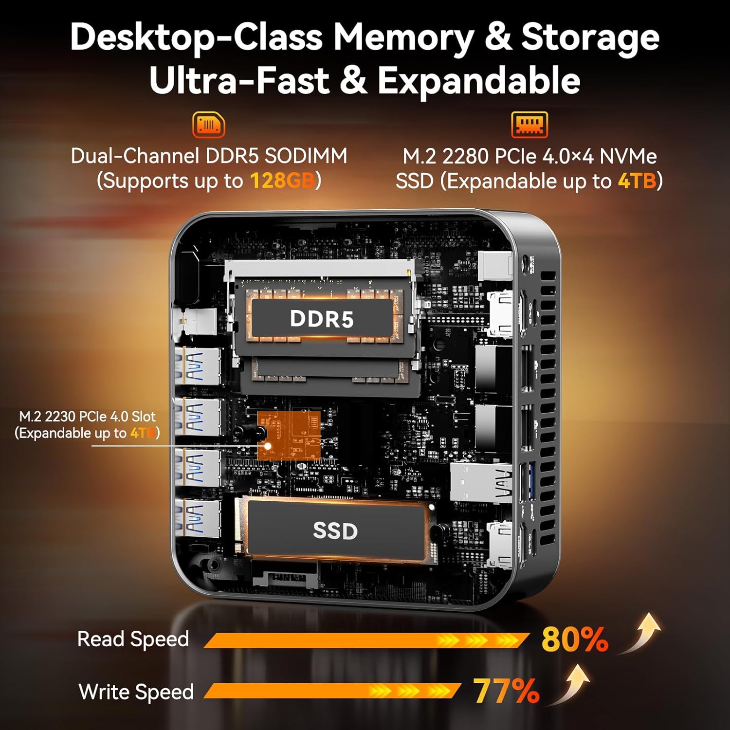 To complement its powerful processor and graphics, the GEEKOM A9 Max is equipped with support for up to 128GB of DDR5-5600MHz RAM in dual-channel mode and dual PCIe Gen4 NVMe SSD slots. This configuration provides exceptional speed and flexibility for demanding multitasking, rapid AI model processing, and intensive creative workflows. The ability to accommodate both high-capacity system drives and ultra-fast scratch disks maximizes productivity, making the A9 Max a versatile tool for a wide range of applications, from content creation to data analysis.