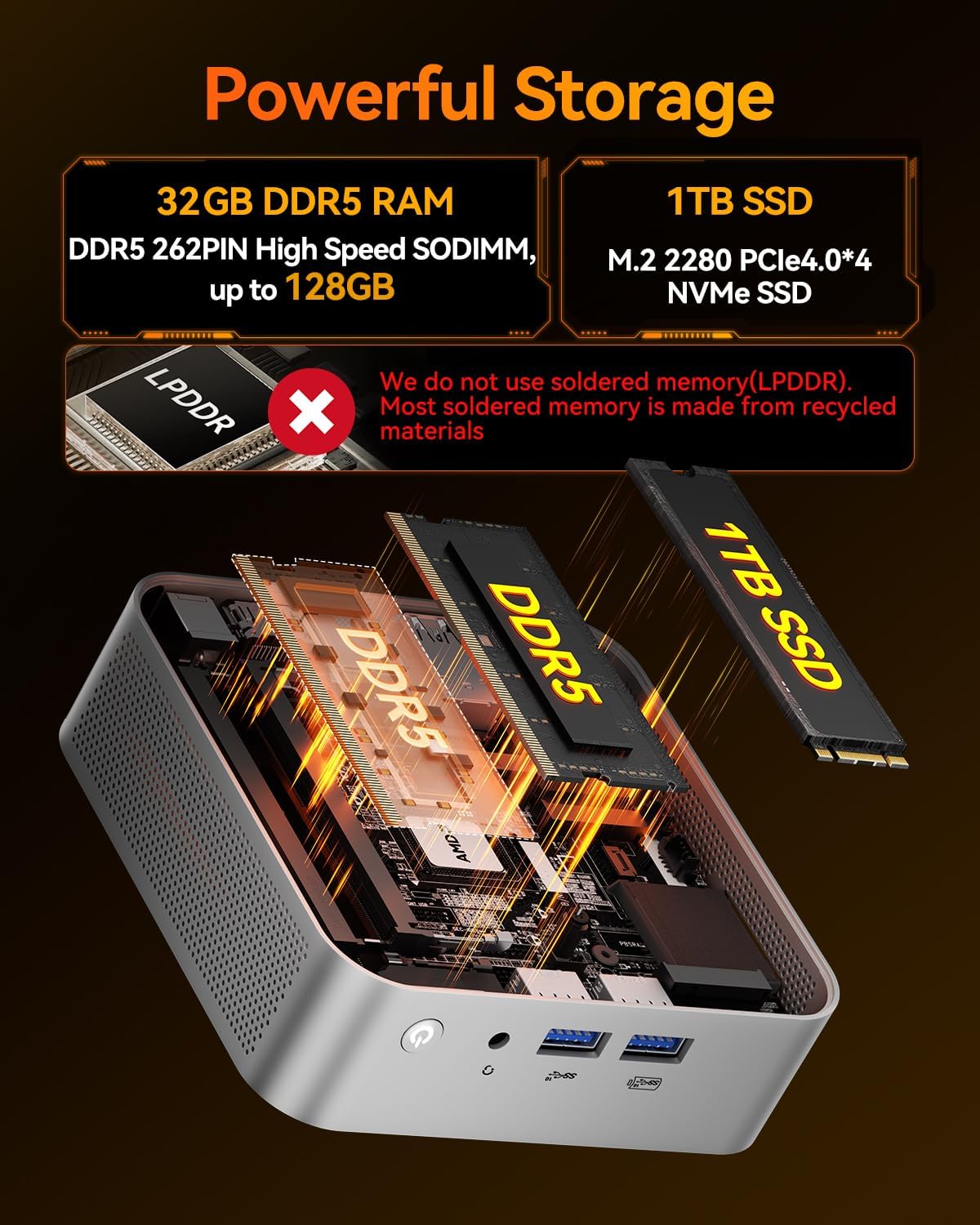 The A8 mini desktop comes with 32GB of high-bandwidth DDR5 RAM, which supports dual-channel expansion up to 128GB. This far exceeds the fixed limitations of soldered LPDDR memory, providing users with the flexibility to upgrade and expand their memory as needed. For storage, the A8 includes a 1TB M.2 2280 NVMe Gen4*4 SSD, which is expandable to 4TB and fully compatible with Gen3 SSDs. This ensures exceptional data transfer speeds and true future-ready flexibility.