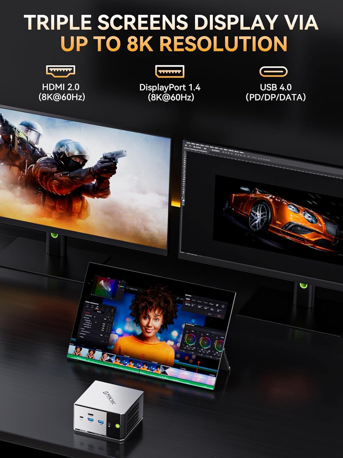 The GMKtec Mini PC AMD Ryzen 5 PRO 6650H comes with a 1TB NVMe SSD, providing ample storage for your operating system, programs, and files. The device also features dual M.2 2280 slots, supporting up to 4TB per slot, for a total storage capacity of 8TB. This provides more than enough room for your entire game library, projects, and media files.