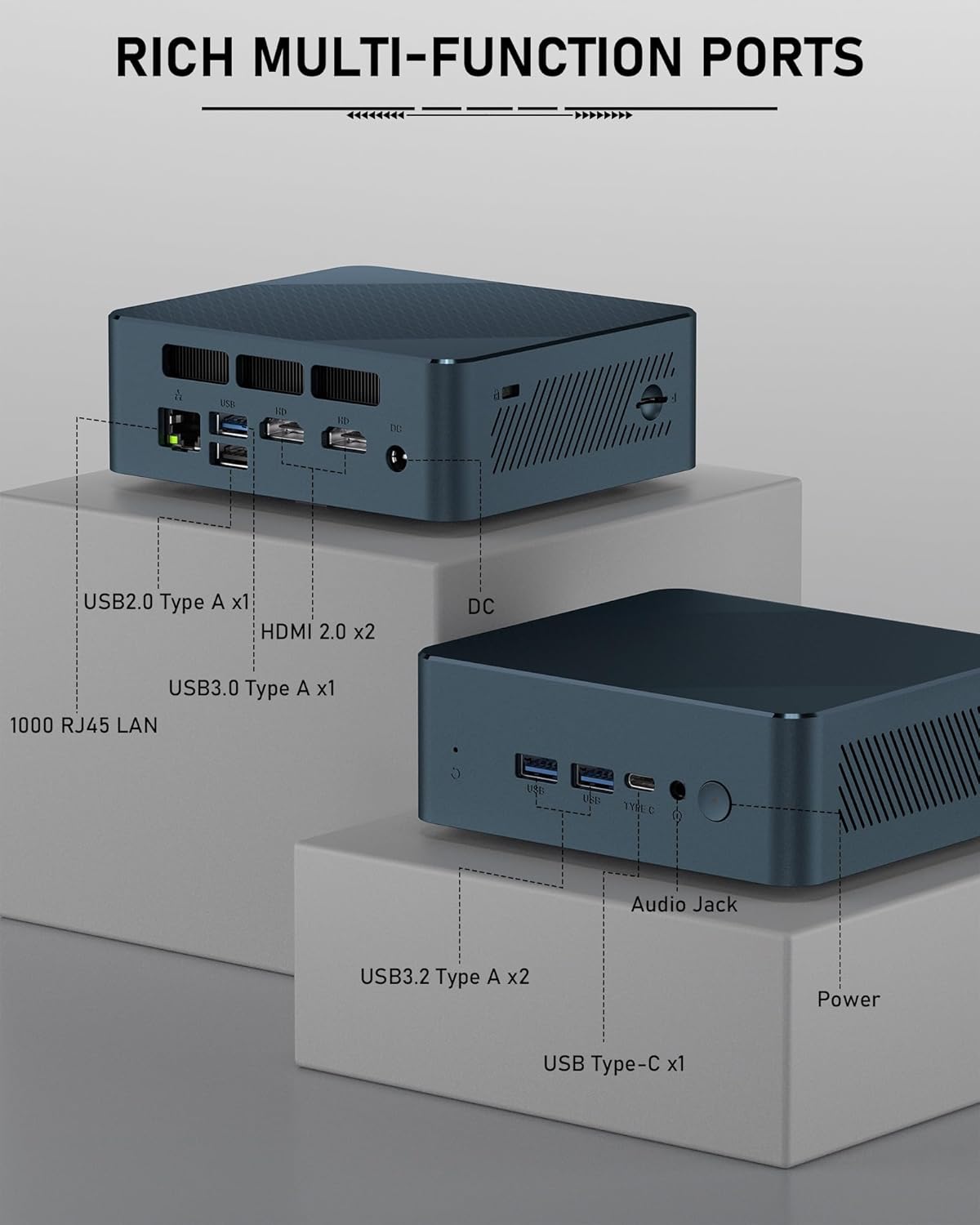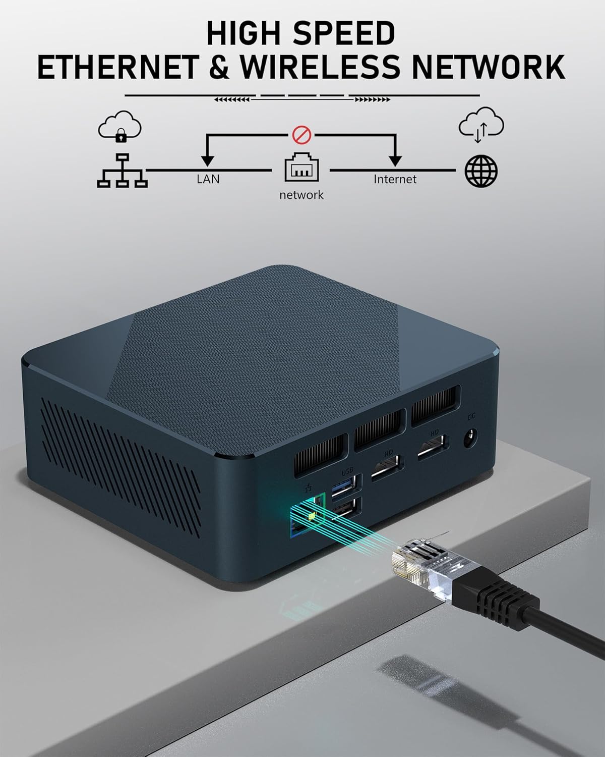 The Getorli Mini PC features a compact design, measuring just 5.02×4.43×1.57 inches. This small form factor makes it an ideal solution for home or office environments where space is limited. The mini PC’s advanced axial-flow fan and honeycomb vents work together to efficiently manage heat while keeping fan noise low, even under load. This thoughtful design ensures a quiet and reliable computing experience, minimizing distractions and interruptions.
